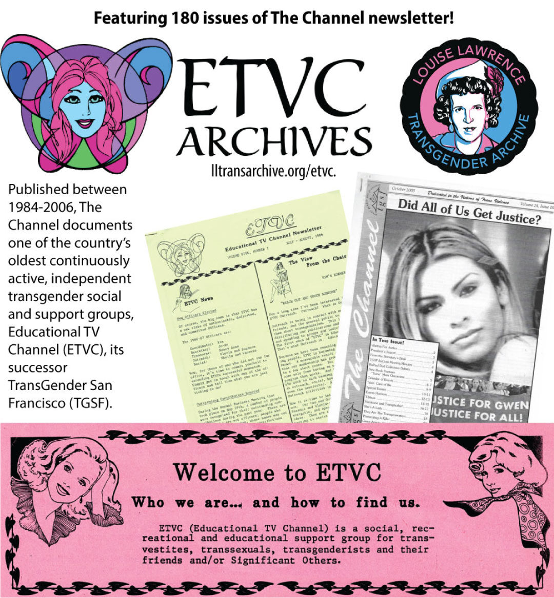 Educational Transvestite Channel (ETVC) was founded in 1982, making it one of the country’s oldest continuously active, independent transgender social and support groups. Unlike groups with restrictive membership policies, ETVC has always been inclusive; open, and welcoming to anyone transgender, trans-curious, or trans-allied. They established a support group for couples, published educational materials, and partied with other San Francisco LGBTQ organizations such as The Sisters of Perpetual Indulgence, The Imperial Court of San Francisco, and the trans-masculine support group FTM International.